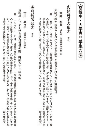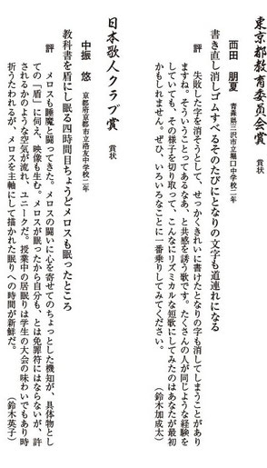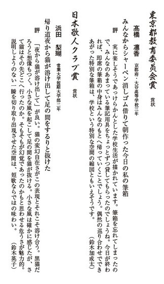 日本歌人クラブでは、小学生・中学生・高校生・大学生・専門学校生の学生およびジュニア世代を対象に短歌作品を毎年募集しており、毎回多くのご応募をいただいています。