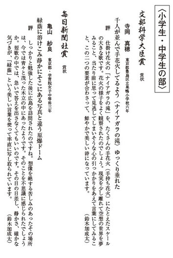 今回の応募数は小学生988首、中学生7887首、高校生3337首、大学・専門学校生157首の、応募総数12369首となりました。今年は特に個人応募の生徒さんたちも多いのが特徴でした。